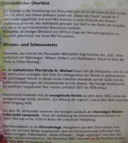 In der anlässlich des Rheinland-Pfalz-Tages im Rathaus zu sehenden Bilderausstellung über die Neustadter Weindörfer waren auch Bilder aus Duttweiler ausgestellt. Die Ausstellung wurde nach dem Fest kurzfristig bis auf Weiteres verlängert.