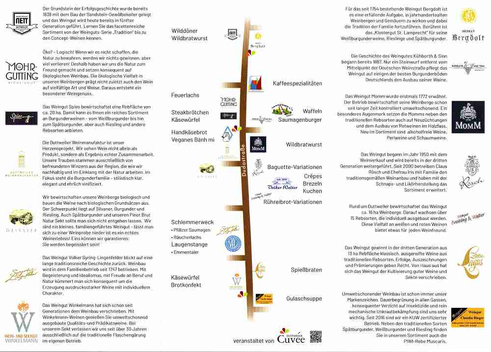 Unzählige Besucher kamen bei bestem Probierwetter wieder zu der einzigartigen Weinprobe nach Duttweiler. Die Dudostraße als Weinmeile von Duttweiler war bis spät in die Nacht voll mit Menschen, die sich bei bester Stimmung durch das vielfältige Angebot der Weingüter probierten. Trotz des Besucheransturms blieb den Winzern noch genügend Zeit, um mit den Weinliebhabern zu fachsimpeln und sie von den Vorzügen ihrer Weine zu überzeugen.